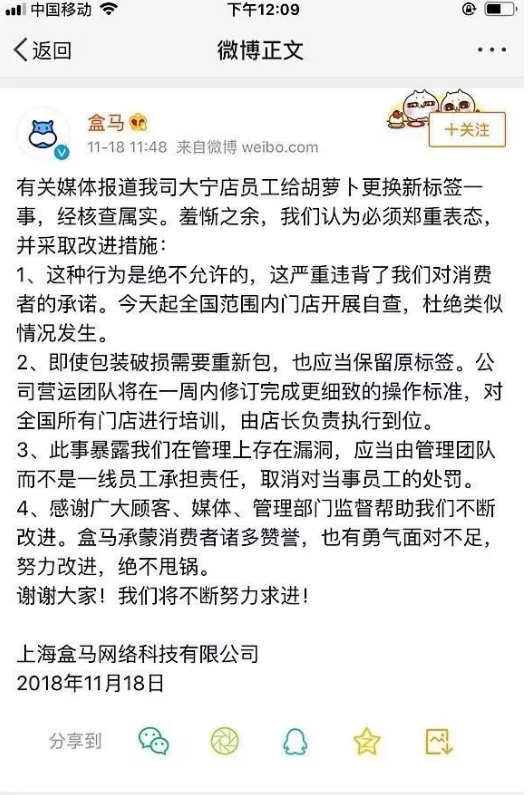 此外,11月18日,盒馬鮮生通過官方微博回應稱,該事件經核查屬實。即使包裝破損需要重新包,也應當保留原標簽,公司營運團隊將在一周內修訂完成更細致的操作標準,對全國所有門店進行培訓,由店長負責執行到位。該事件暴露了管理的漏洞,應由管理團隊而非一線員工承擔責任,取消對當事員工的處罰。