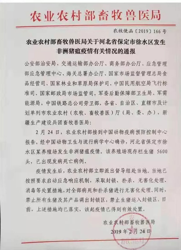 公告顯示,農業農村部接到中國動物疫病預防控制中心報告,經中國動物衛生與流行病學中心確診,保定市徐水區某養殖場發生非洲豬瘟疫情。該養殖場現存欄生豬5600頭,已出現發病死亡病例。