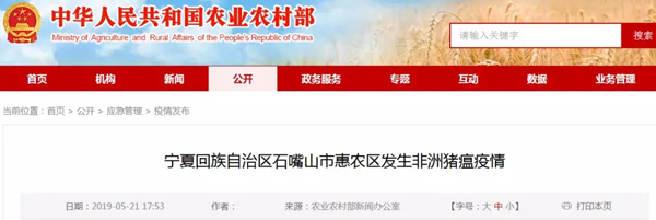 5月21日15時,農業農村部接到中國動物疫病預防控制中心報告,經寧夏回族自治區動物疫病預防控制中心確診,石嘴山市惠農區河濱街道辦事處某養殖戶發生非洲豬瘟疫情。截至目前,該養殖戶存欄生豬40頭,發病4頭,死亡3頭。