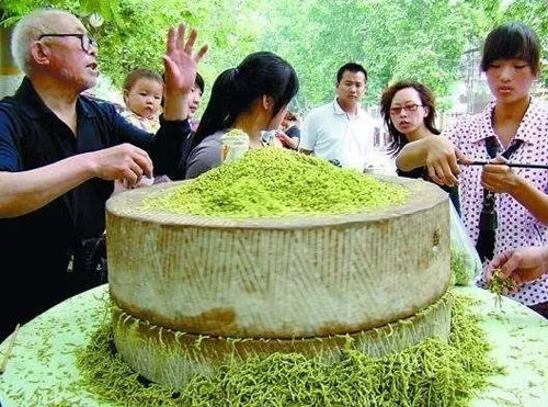 制作碾轉(zhuǎn),需將青麥仁蒸煮、晾干,拌上熟油,上石碾軋制成一段段的繩狀即可。碾轉(zhuǎn)具有獨特的嚼勁和青麥香味,可直接食用,也可涼拌或炒制后食用。