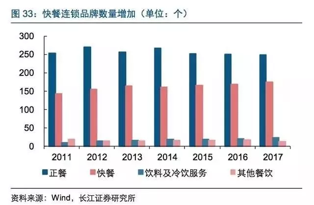 對比了2011年以來限額以上餐飲企業收入占社零餐飲收入的比值會發現,2013年之前比值呈上升趨勢,但近年來則出現明顯的階梯下降態勢,表明行業分散化的格局或在加劇。從結構上看,快餐連鎖品牌占比大幅增加,正餐連鎖品牌小幅下降,新興品牌的規模通常較小,因此也進一步加劇了行業分散的趨勢。