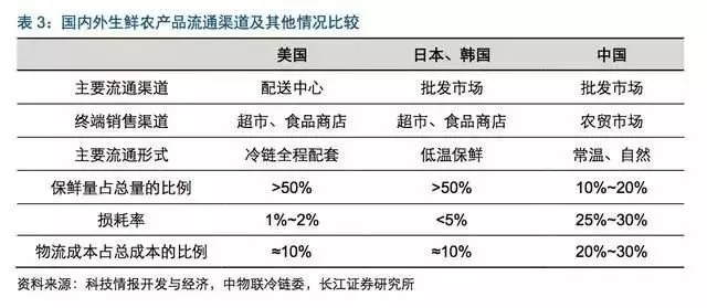 中國生鮮食品流通效率低下且安全問題突出。據不完全統計,2015年我國果蔬、肉類、水產品的冷鏈流通率分別達到22%、34%、41%,冷藏運輸率分別為35%、57%、69%。與發達國家相比,差距巨大。