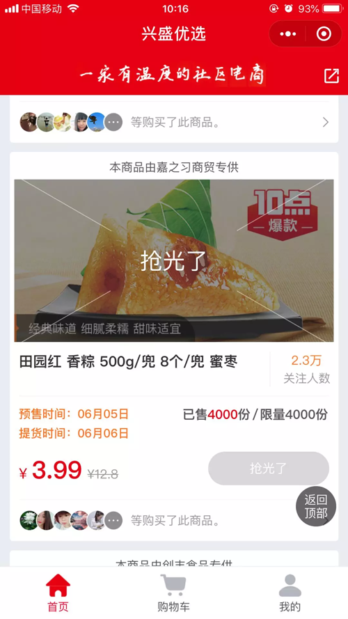昨天上午,興盛優選推出一款500克的田園紅香粽,售價3.99元。10點開賣,僅僅2分鐘就賣出4000份,共1108人參與購買。