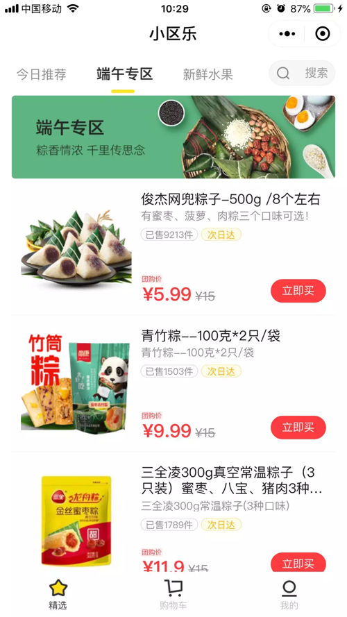 小區樂在小程序中專門設置了“端午專區”,一款500克的俊杰網兜粽,截至6月5日上午10:29,已售出9213件。