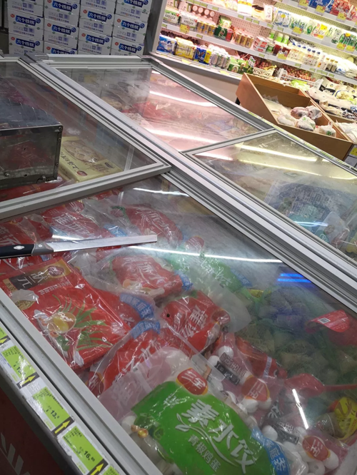 由于冷柜沒有顯示溫度,只能把手伸進去感知,結果是——稍感涼爽,凍感不強,但比菜店情況稍好。