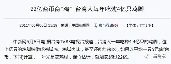 至于臺灣省的數據,2011年臺灣TVBS電視臺報道,臺灣人一年吃掉4.4億只的雞腳,其中4億只為本省肉雞提供(2億出欄量)。