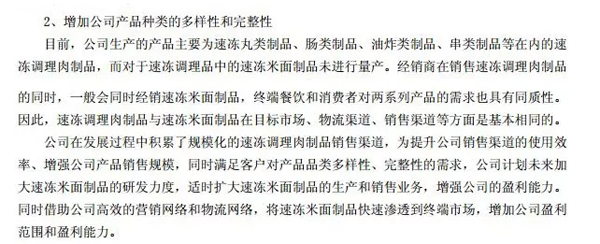 這點可以看看惠發食品的2018年年報。年報中說,經銷商在銷售速凍調理肉制品的同時,一般會同時經銷速凍米面制品。為滿足客戶對產品品類多樣性、完整性的需求,公司計劃未來加大速凍米面制品的研發力度,適時擴大速凍米面制品的生產和銷售業務。