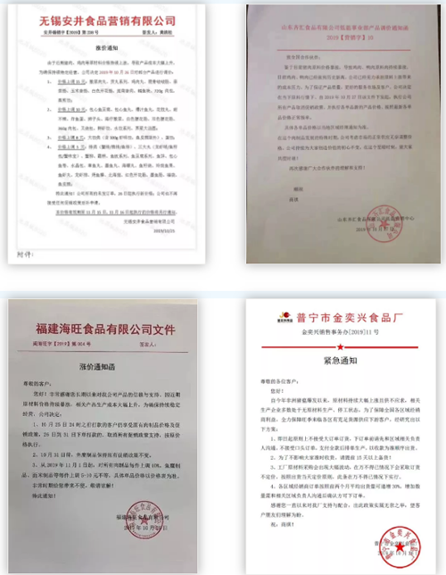 1、安井、海旺食品接連發布產品調價通知函