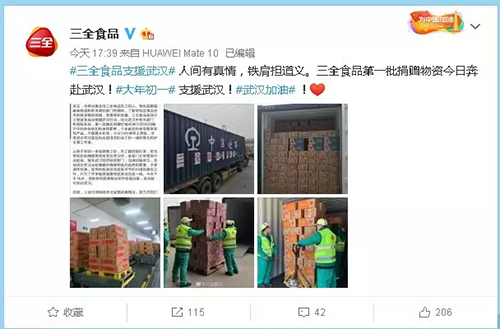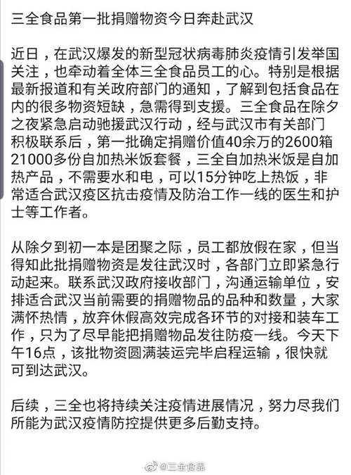 三全食品馳援武漢