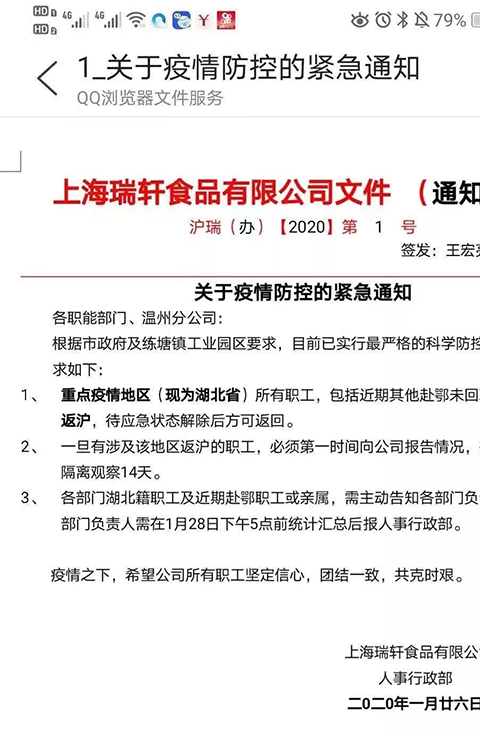 上海瑞軒食品有限公司則針對疫情下發了緊急通知。