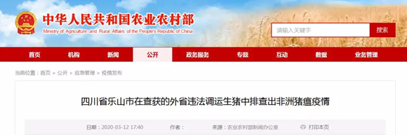 3月12日,農(nóng)業(yè)農(nóng)村部接到中國動物疫病預(yù)防控制中心報告,經(jīng)四川省動物疫病預(yù)防控制中心確診,在樂山市五通橋區(qū)冠英鎮(zhèn)查獲的一輛來自外省的生豬運(yùn)輸車中,排查出非洲豬瘟疫情。查獲時,該車輛共載有生豬111頭,死亡7頭。
