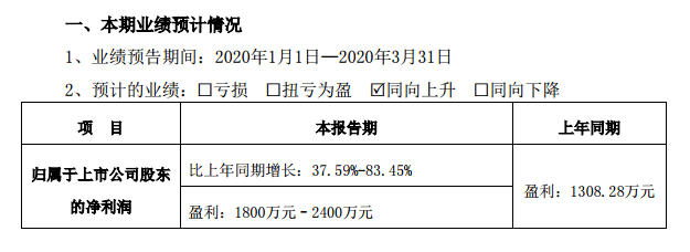 4月10日,海欣食品(002702)發(fā)布今年一季度業(yè)績預(yù)告:2020年1月1日至2020年3月31日預(yù)計(jì)盈利1800萬元–2400萬元,上年同期盈利1308.28萬元,同比增長37.59%-83.45%。