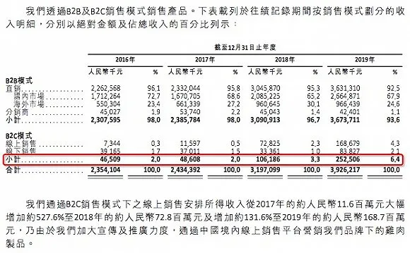 盡管鳳祥食品90%以上的銷售通過B2B方式銷往國內(nèi)外,但B2C模式為業(yè)績貢獻(xiàn)的比例正在增加,尤其是線上銷售占比,已經(jīng)從2016年的0.3%提升至2019年的4.3%。