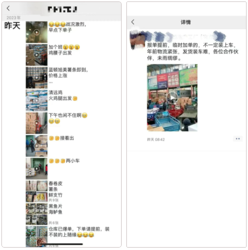 2023年1月1日起,市場迎來交易高峰,出現爆單、堵車、裝不上車等旺季特有現象。通常清閑的下午,也在忙著發貨。1月3日當天,李鵬連發12條“出貨”朋友圈,“吐槽”一把忙碌的幸福。